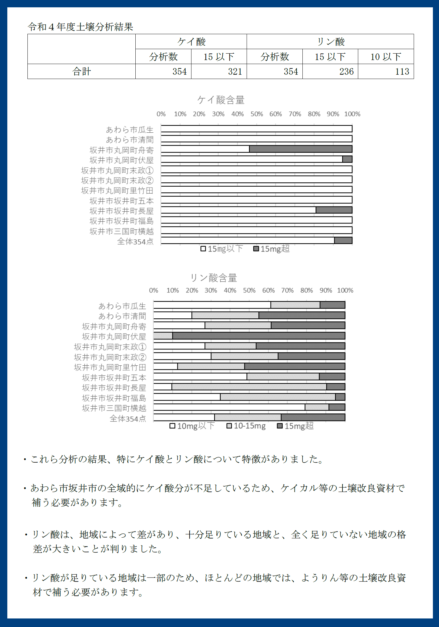 成分を効果的に補い肥料コストを低減する目的として、坂井農林総合事務所と連携し行った土壌分析結果です。