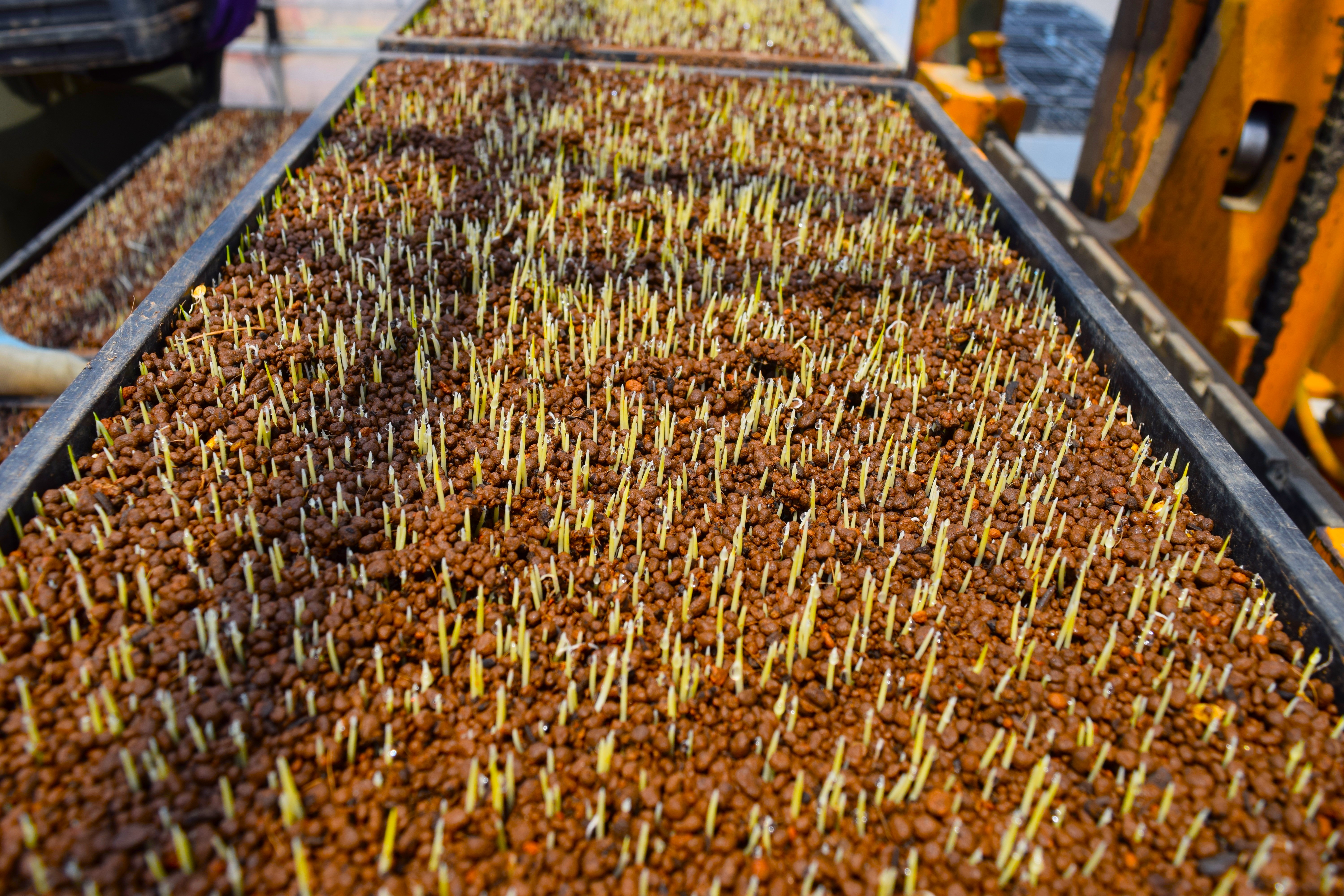 お米を作るときは、種もみを田んぼにまかずに芽が出て大きくなるまで育苗箱で育てます。ある程度芽が出たら、ビニールハウスに移し、温度や水分コントロールしながら均一に生育させます。この作業は今後の生育に大きく影響を受けるため、非常に慎重な作業になります。