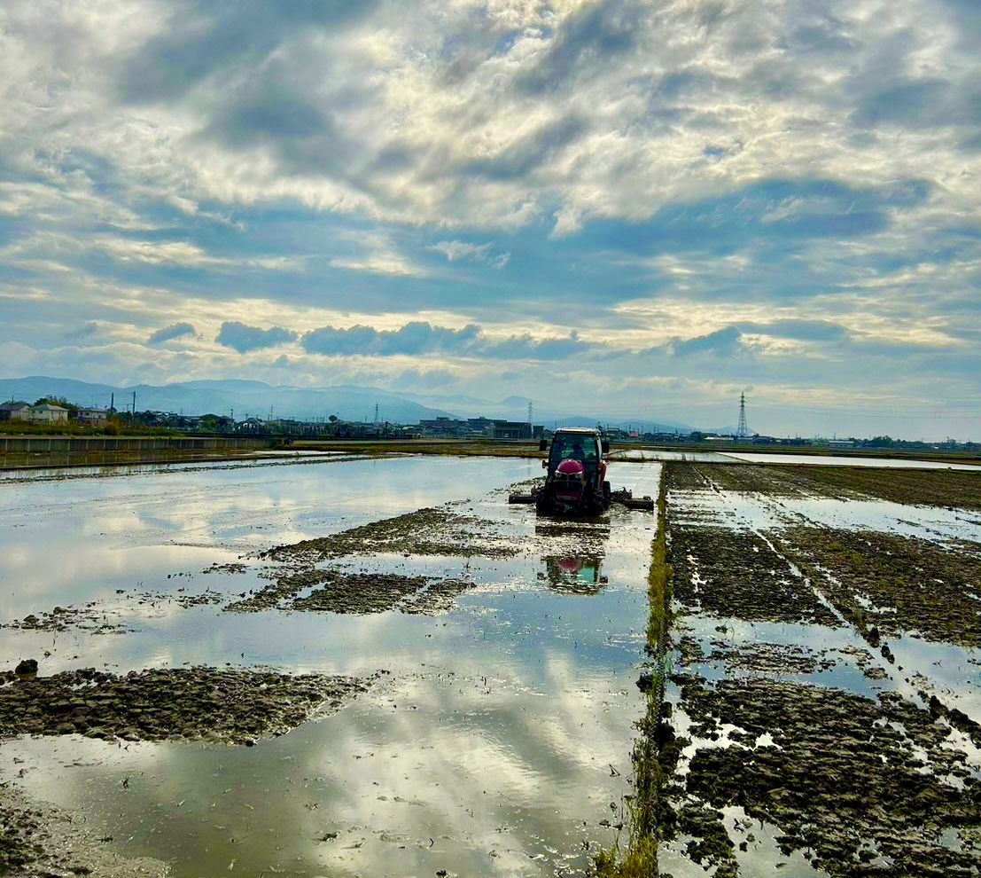田起こしの後、田んぼに水を入れて土と混ぜ合わせ、機械でかき混ぜ泥状にします。これを代かきと言いますが、代かきには田んぼの水漏れを防ぎ、均平をとり、苗を植え付けやすくするよう土を柔らかくするなどの効果があります。